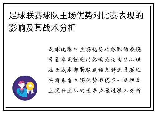 足球比赛中,主场优势对球队的表现有着举足轻重的影响。无论是从心理层面、战术部署、球迷的支持还是赛程安排来看,主场优势都能在一定程度上提升主队的竞争力。通过深入分析足球联赛中球队主场优势的各个方面,可以...