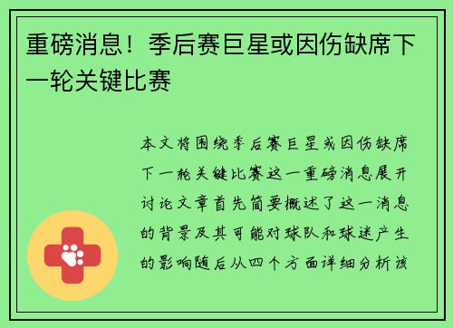 本文将围绕“季后赛巨星或因伤缺席下一轮关键比赛”这一重磅消息展开讨论。文章首先简要概述了这一消息的背景及其可能对球队和球迷产生的影响,随后从四个方面详细分析该消息所带来的影响:巨星球员的伤情分析、伤病...